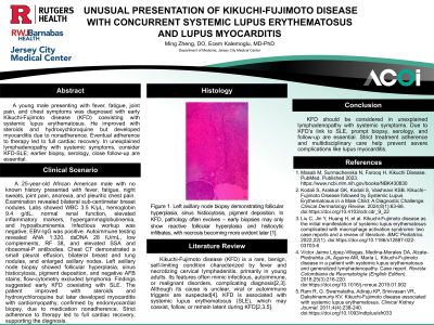 Evidence/Literature Review: Kikuchi-Fujimoto disease (KFD) is a rare, benign, self-limiting condition characterized by fever and necrotizing cervical lymphadenitis, primarily in young adults. Its features often mimic infectious, autoimmune, or malignant disorders, complicating diagnosis[1,2]. Although its cause is unclear, viral or autoimmune triggers are suspected[3]. KFD is associated with systemic lupus erythematosus (SLE), which may coexist, follow, or remain latent during KFD[1,2,4].